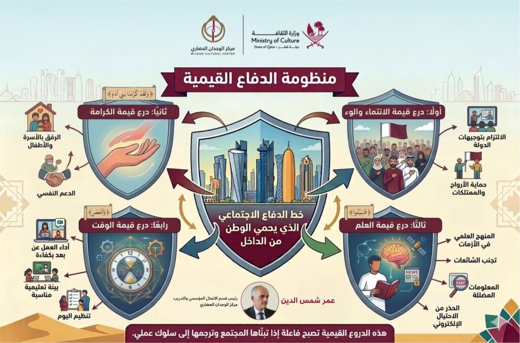 هنا تبرز ما أسميه “منظومة الدفاع القيمية” بوصفها خط الدفاع الاجتماعي الذي يحمي الوطن من الداخل، ويحوّل المحن إلى منح، ويجعل من القيم دروعًا فاعلة في مواجهة التحديات.